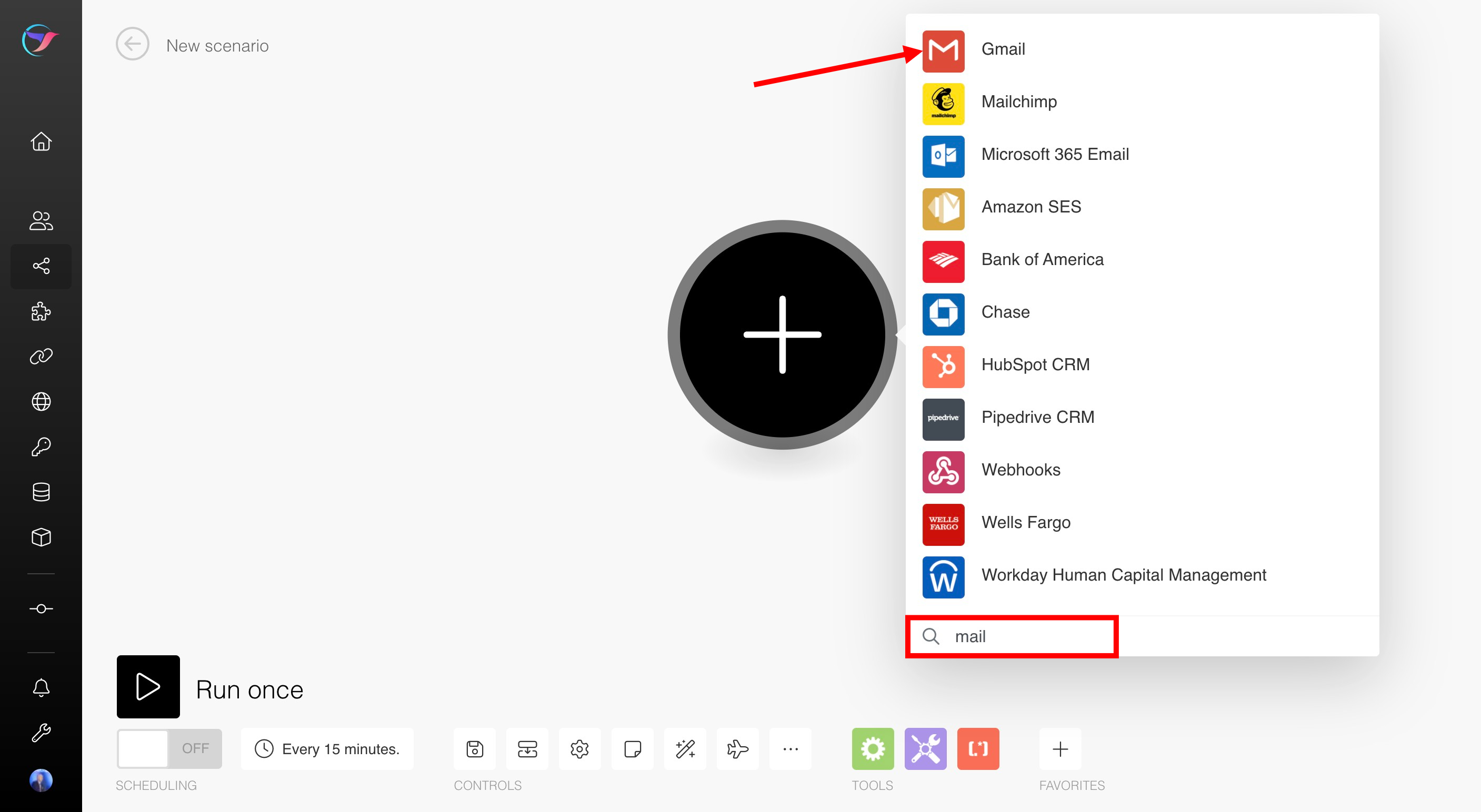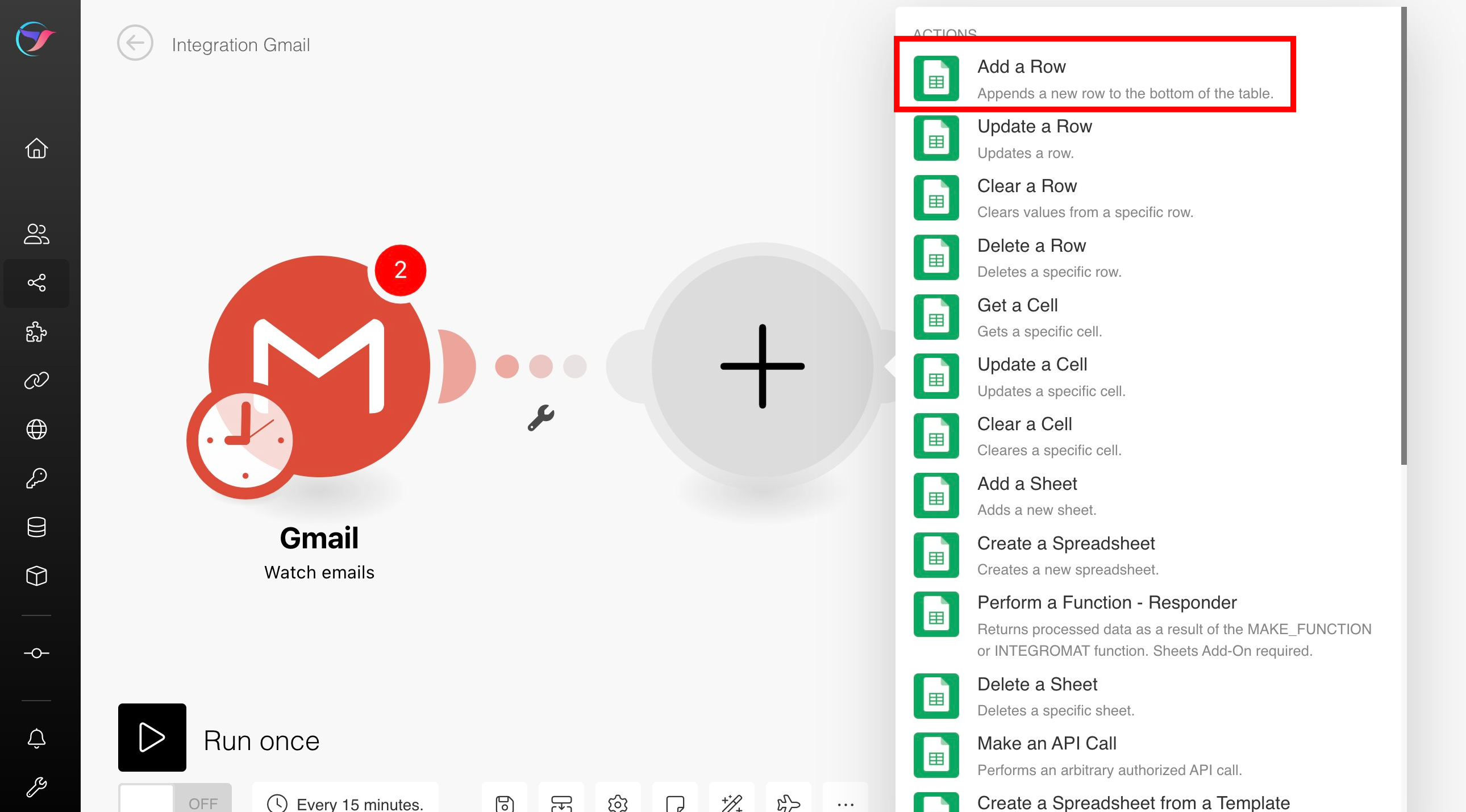 To exemplify how to create a scenario, we will go through the process step-by-step. In our example scenario, we are adding new incoming emails to a Excel Sheets spreadsheet as a new row.
